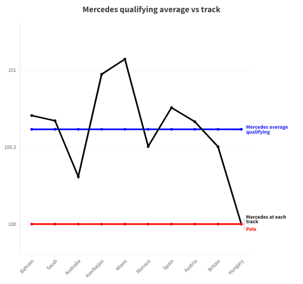 The chart shows Mercedes’ qualifying average (blue) vs the track performance (black).