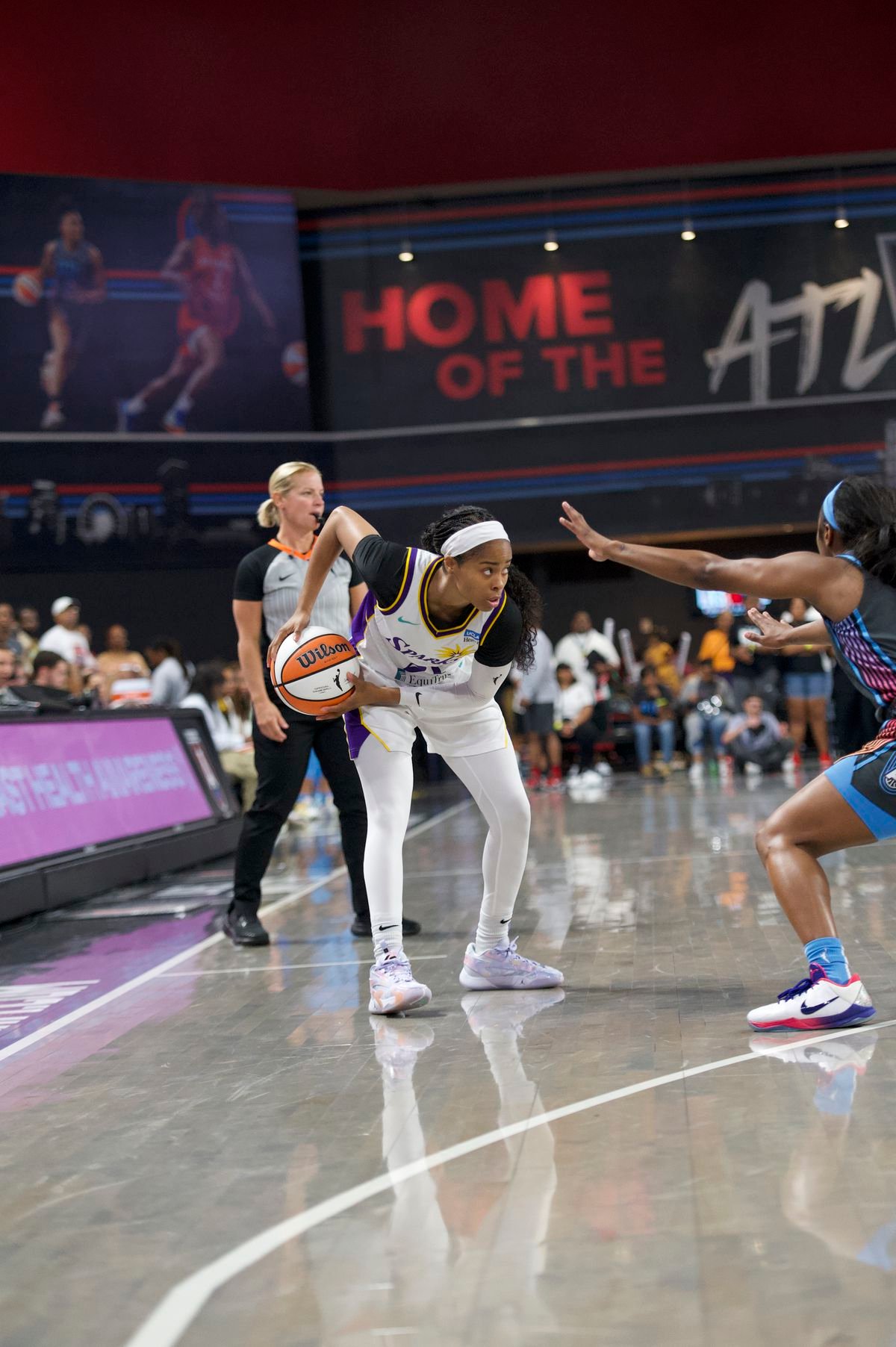Defended by the Dream’s Rhyne Howard, the Sparks’ Layshia Clarendon assesses their offensive options. With 14 points and four assists, Clarendon continues to be a difference maker for LA. Howard had 15 points for Atlanta.Christina Merrion.