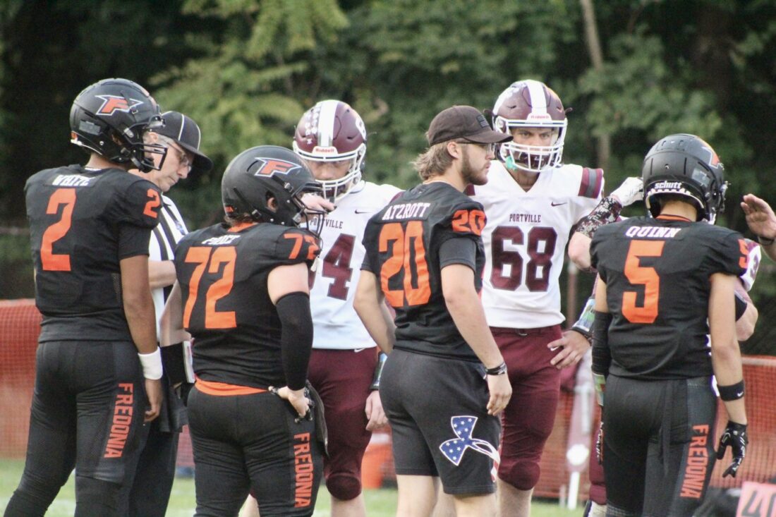 Fredonia football captains Davion White (2), Simon Price (72), Sam Atzrott (20), and Jameson Quinn (5) went out for the opening coin toss last Friday night against Portville. Atzrott did not play because of injury; Quinn sustained a concussion during the game; and White left the field in an ambulance due to an upper body injury that halted play for nearly 20 minutes.
