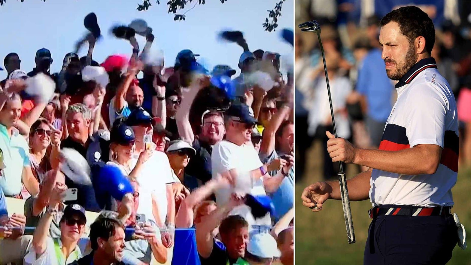 Fans waving their hats at Patrick Cantlay at the Ryder Cup on Saturday.