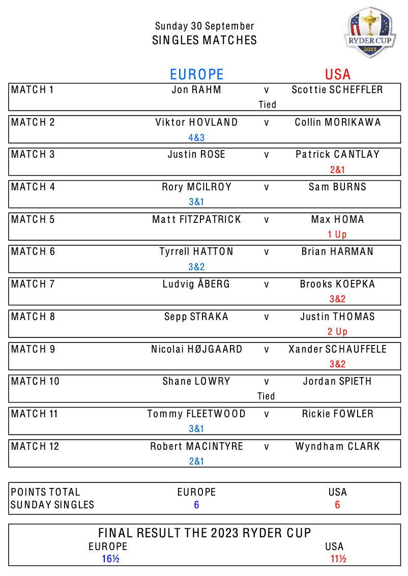 Rory McIlroy, playing in match 4, and Tyrrell Hatton in match 6, added two more points, the former seeing off Sam Burns 3&2 amid emotional scenes, and the latter dispatching Open champion Brian Harman 2&1, to take Europe to 14 points, but with Justin Rose losing to Patrick Cantlay in match 3, and Max Homa winning 1up against Matt Fitzpatrick in match 5, the host side were still a half-point shy of the total they needed and with the middle section of matches showing a sea of red.