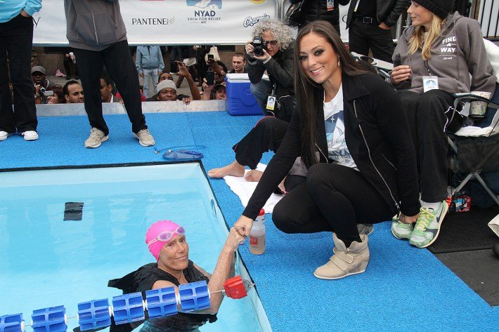 Diana Nyad, in a pool for a Good Morning America swim stunt for Hurricane Sandy relief, bumps fists with Sammi Sweetheart from Jersey Shore. Getty Images