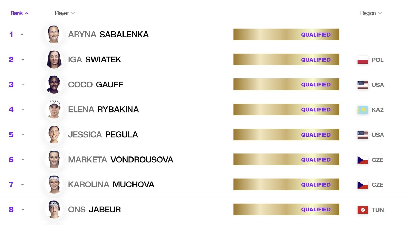 Five of the eight players have previously won Grand Slam titles, and five have already competed at the event beore. Vondrousova, Muchova and Rybakina will each be making their WTA Finals debut.