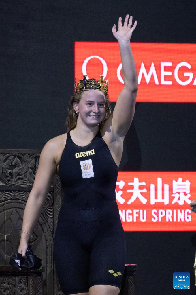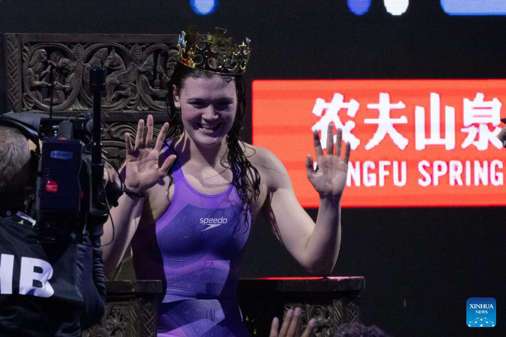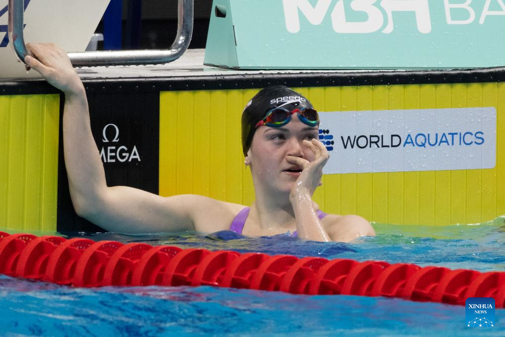 Erika Fairweather of New Zealand reacts after winning the women’s 400m freestyle final at the World Aquatics Swimming World Cup 2023 in Budapest, Hungary, on Oct. 20, 2023. (Photo by Attila Volgyi/Xinhua)
