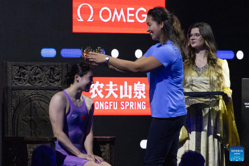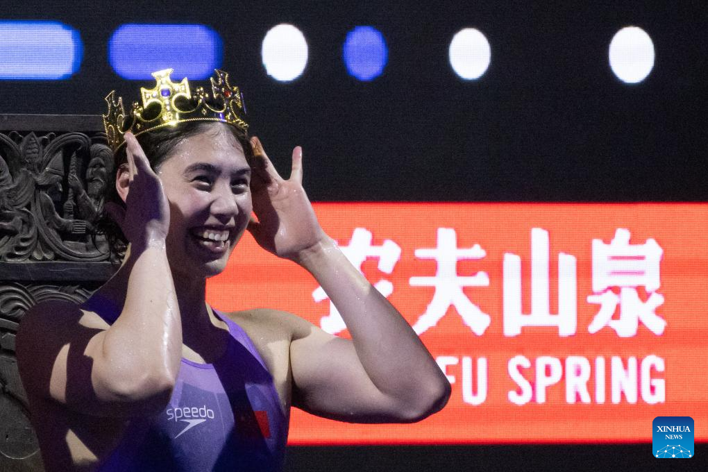 Zhang Yufei of China reacts after winning the women’s 200m butterfly final at the World Aquatics Swimming World Cup 2023 in Budapest, Hungary, on Oct. 20, 2023. (Photo by Attila Volgyi/Xinhua)