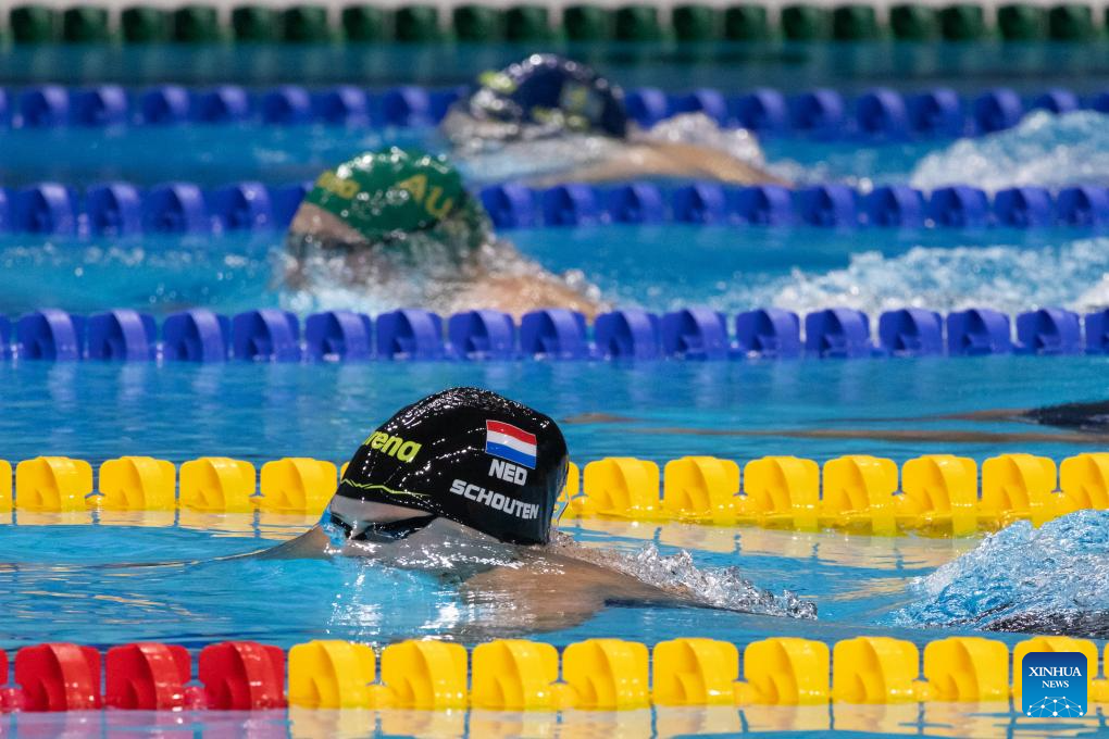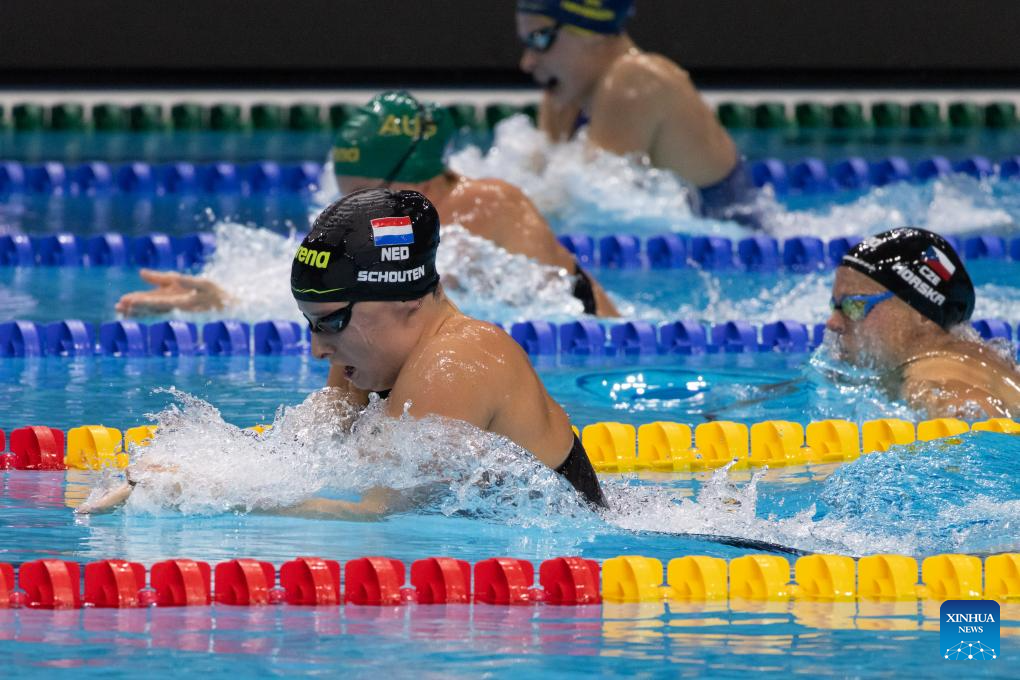 Tes Schouten (front) of the Netherlands competes during the women’s 200m breaststroke final at the World Aquatics Swimming World Cup 2023 in Budapest, Hungary, on Oct. 20, 2023. (Photo by Attila Volgyi/Xinhua)