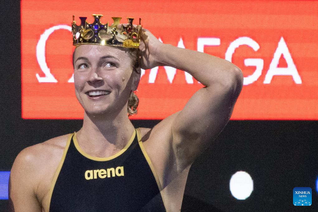Sarah Sjoestroem of Sweden reacts after winning the women’s 50m freestyle final at the World Aquatics Swimming World Cup 2023 in Budapest, Hungary, on Oct. 20, 2023. (Photo by Attila Volgyi/Xinhua)