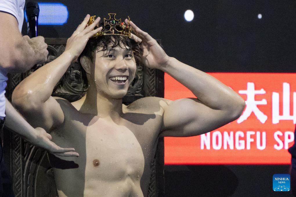Qin Haiyang of China reacts after winning the men’s 100m breaststroke final at the World Aquatics Swimming World Cup 2023 in Budapest, Hungary, on Oct. 20, 2023. (Photo by Attila Volgyi/Xinhua)