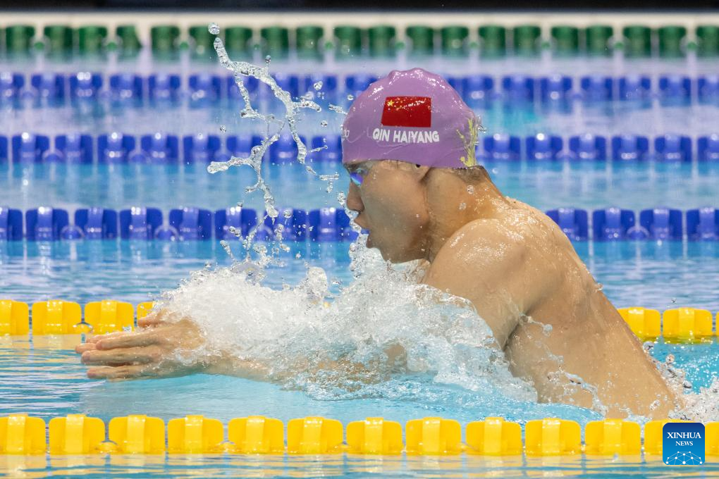 Qin Haiyang of China competes during the men’s 100m breaststroke final at the World Aquatics Swimming World Cup 2023 in Budapest, Hungary, on Oct. 20, 2023. (Photo by Attila Volgyi/Xinhua)