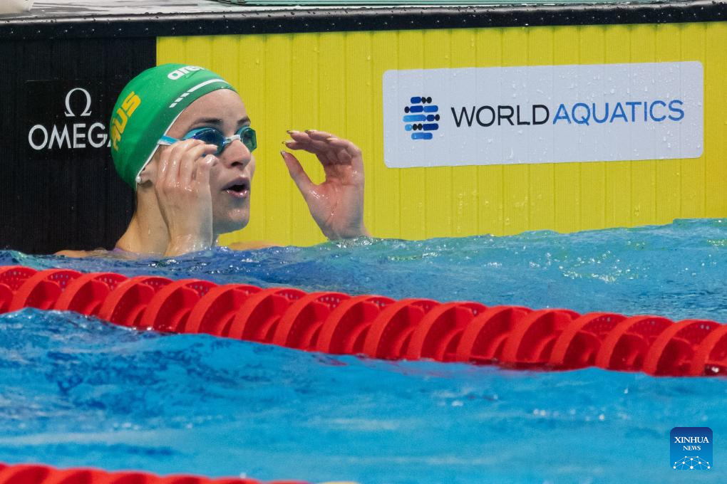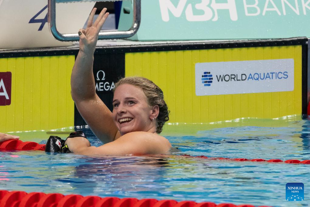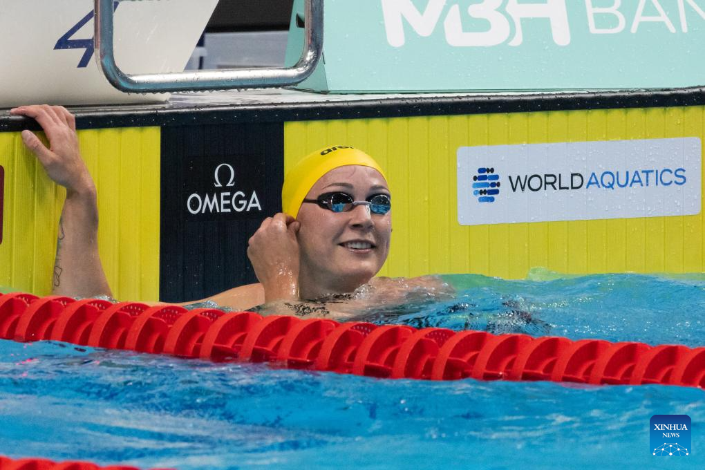 Kaylee McKeown of Australia reacts after winning the women’s 50m backstroke final at the World Aquatics Swimming World Cup 2023 in Budapest, Hungary, on Oct. 20, 2023. (Photo by Attila Volgyi/Xinhua)