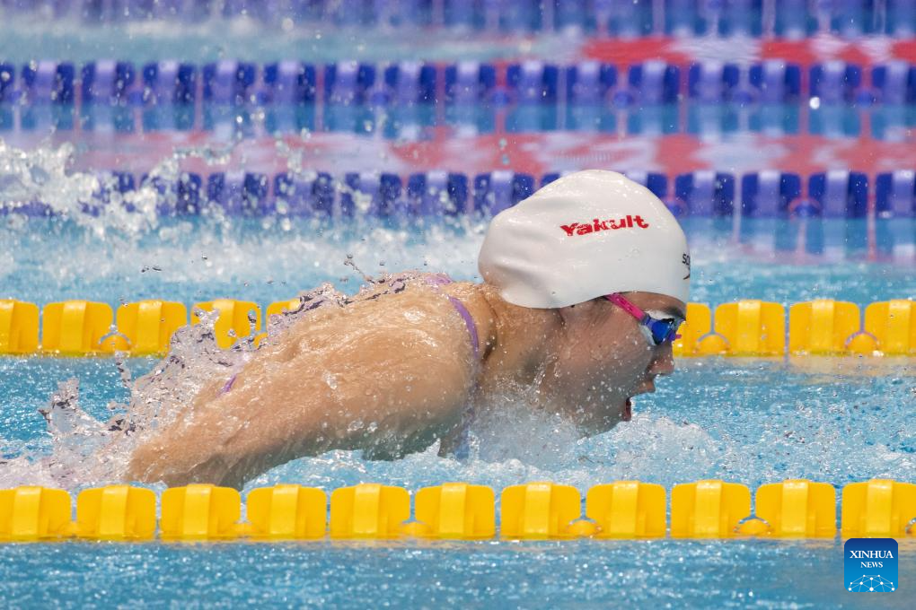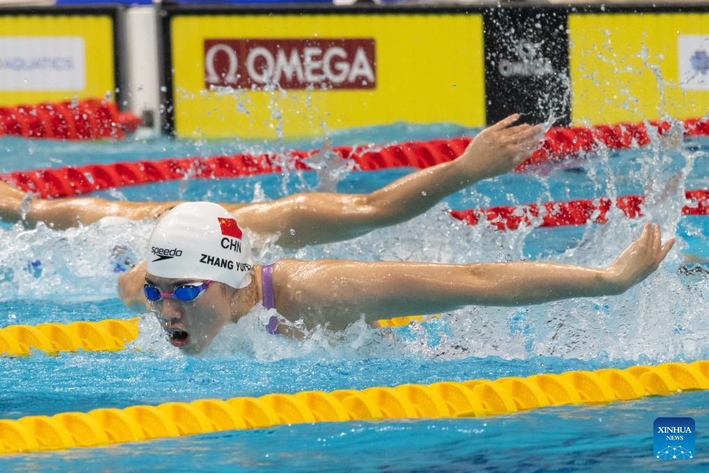 Zhang Yufei of China competes during the women’s 200m butterfly final at the World Aquatics Swimming World Cup 2023 in Budapest, Hungary, on Oct. 20, 2023. (Photo by Attila Volgyi/Xinhua)