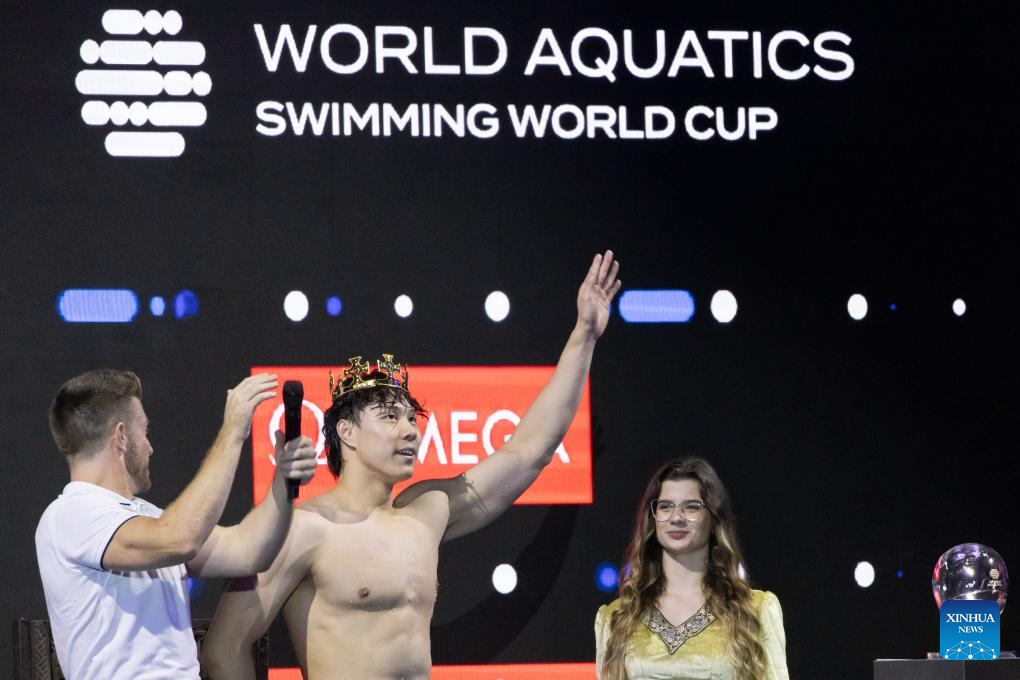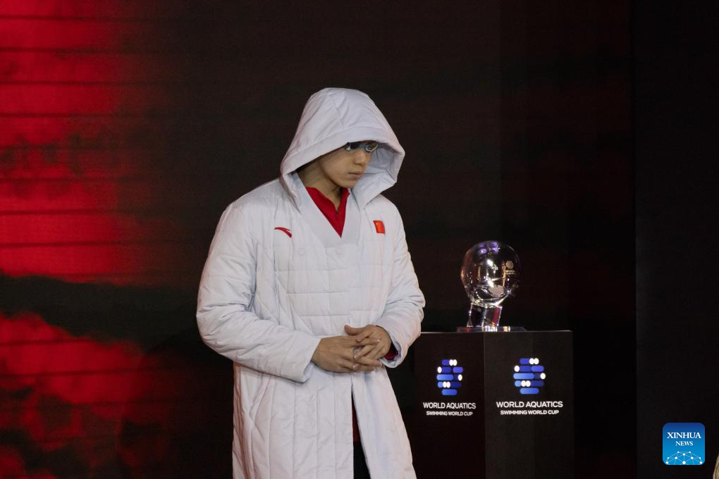 Qin Haiyang of China prepares before the men’s 100m breaststroke final at the World Aquatics Swimming World Cup 2023 in Budapest, Hungary, on Oct. 20, 2023. (Photo by Attila Volgyi/Xinhua)