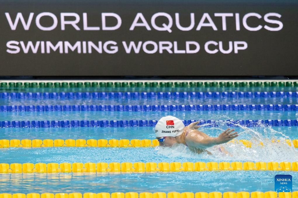 Zhang Yufei of China competes during the women’s 200m butterfly final at the World Aquatics Swimming World Cup 2023 in Budapest, Hungary, on Oct. 20, 2023. (Photo by Attila Volgyi/Xinhua)