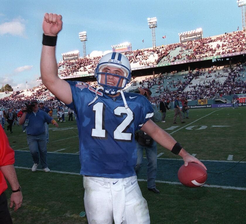 Steve Sarkisian celebrates after the Cougars knocked off Kansas State in the Cotton Bowl in 1996. The former BYU QB is now the head coach of the Texas Longhorns, who host the Cougars Saturday afternoon in Austin.