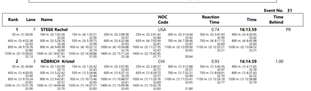 Stege took down the previous Pan Am mark of 16:16.54, established by Argentine Delfina Pignatiello (the only other time the event was contested at the Games) while also obliterating her previous best of 16:29.55 set at U.S. Nationals on July 1.