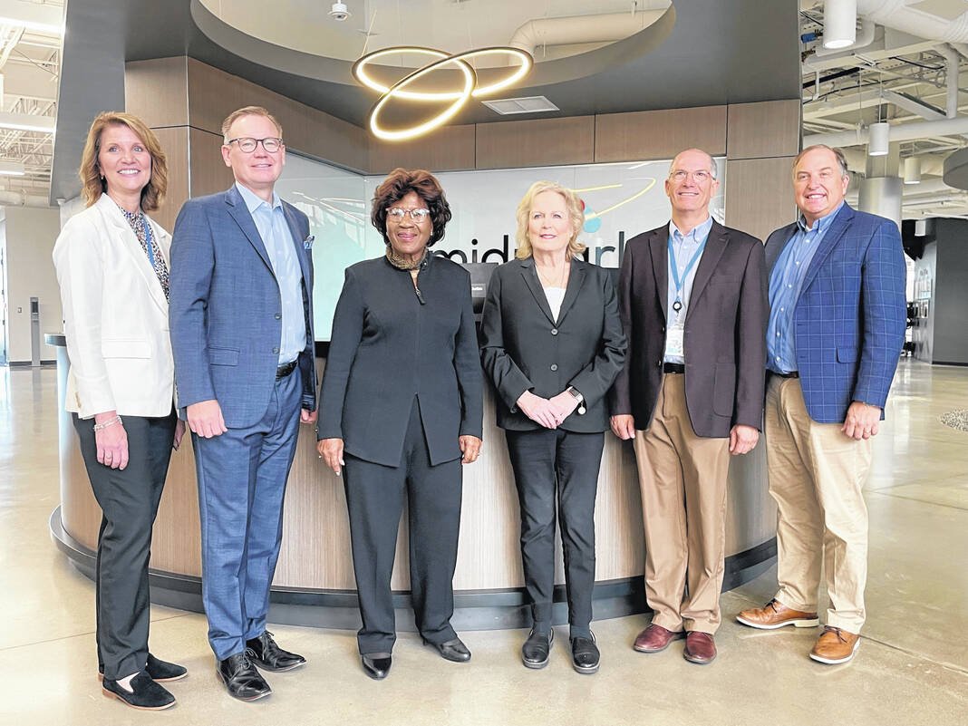 Sue Hulsmeyer, Jon Wells, Deloris Jordan, Diane Wilson, Mitch Eiting, and Dr. Tom Schwieterman gather for a photo before taking a tour of the Midmark facilities.