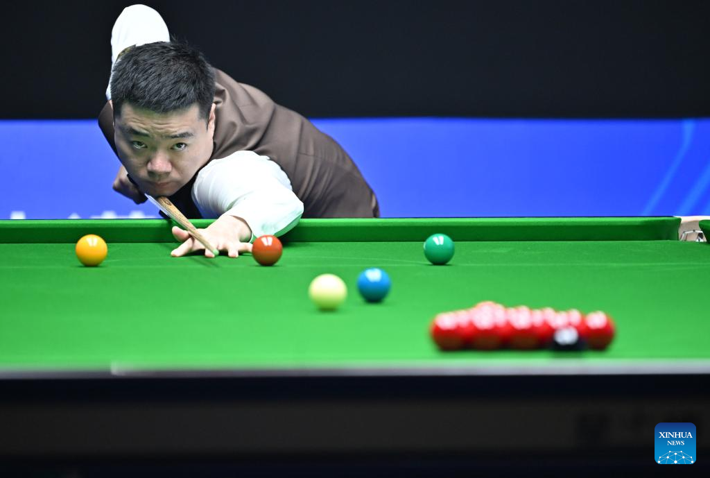 Ding Junhui (C) competes during the round 1 match between Ding Junhui of China and Ian Burns of England at World Snooker International Championship 2023 in north China’s Tianjin Municipality, on Nov. 5, 2023. (Xinhua/Li Ran)