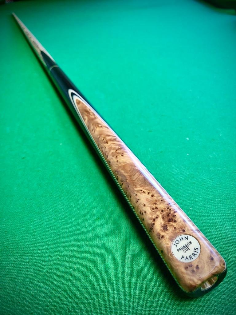 The cue is a Paragon model. It has an Ash shaft, Ebony hand spliced butt with a Thuya face splice over white black white veneers. It is 58” long with a 9.5mm tip and weighs18.3oz.