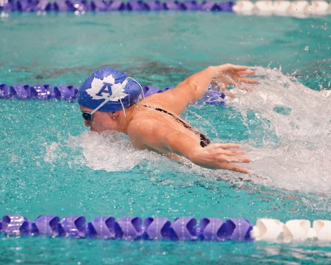 Adrian's Ella Salenbien swims in the 200 medley relay during a swimming tri-meet held at Adrian earlier in the 2023 fall sports season. Salenbien is a member of the girls' swimming and diving team that placed 11th in Division 3 at the MHSAA state championships at Oakland University.