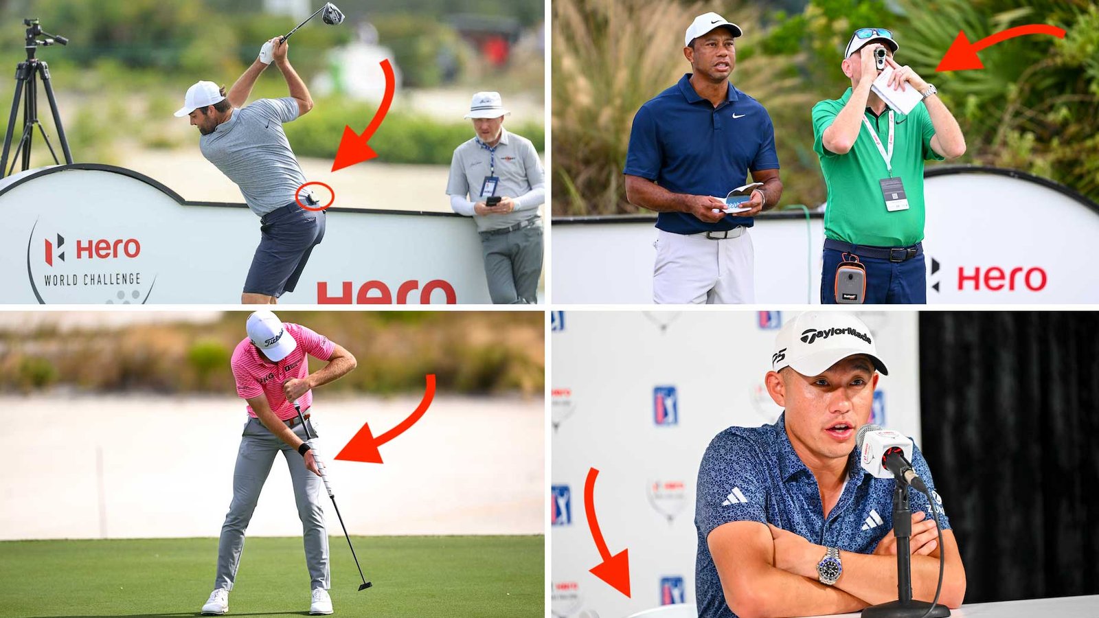 Scottie Scheffler with a new bit of PGA Tour technology, Tiger Woods with a new face on the bag, Collin Morikawa with a new perspective on sitting and Will Zalatoris with a new putter in his bag. (Clockwise from top left)