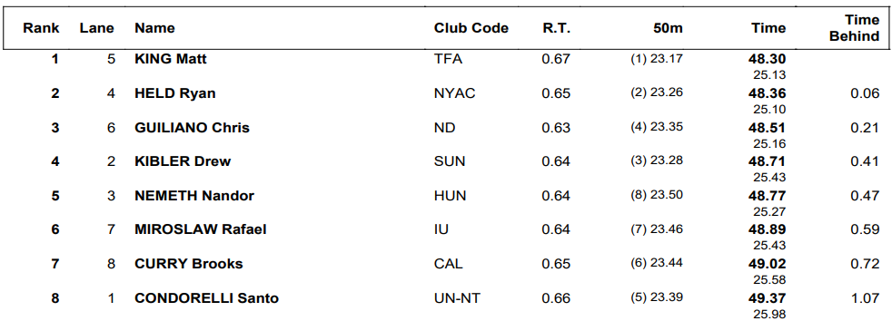 Three others broke 49 in the A-final, with Drew Kibler fourth (48.71) ahead of Nandor Nemeth (48.77) and Rafael Miroslaw (48.89), but the racing in the B-final had five others getting under that barrier.
