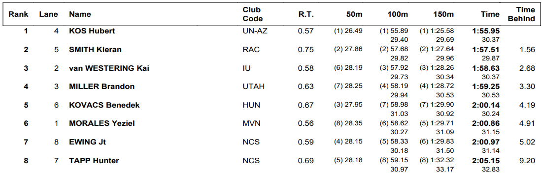 Kos touched in 1:55.95, less than two seconds shy of the 1:54.14 he recorded on the way to a breakthrough world title in July in Fukuoka. Smith took second in 1:57.51, with Indiana’s Kai van Westering placing third in 1:58.63. The second-best time of the evening, however, came from the B-final as Virginia’s Jack Aikins jumped out to a big lead on the way to a time of 1:56.82.