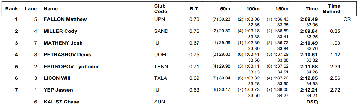 Fallon, who owns a best time of 2:07.71, clocked 2:09.49 to secure the win, 35-hundredths ahead of Cody Miller, the 2016 Olympic bronze medalist in the 100 breast. Miller closed well to take second in 2:09.84 while Matheny placed third in 2:10.49. Denis Petrashov, who grabbed the win in the 100 breast Friday, was fourth in 2:10.61.