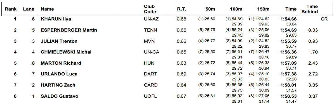 But Kharun grabbed the win in 1:54.66, three hundredths ahead of Espernberger’s 1:54.69. Mission Viejo’s Trenton Julian surged forward over the middle portion of the race before taking third in 1:55.59 while Michal Chmielewski, who went 1:54.88 for the top time in prelims, swam much slower in the final to place fourth (1:56.36).