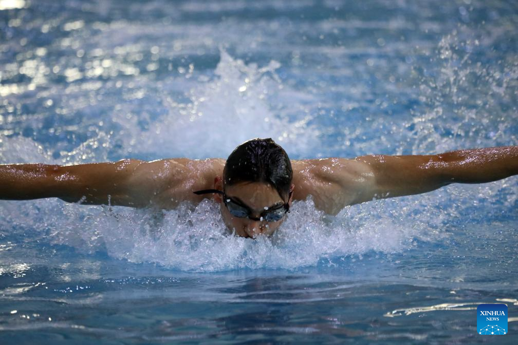Iraqi swimmer Hasan Ali Khaleel Al-Zinkee attends a training session for Paris 2024 Olympic Games in Baghdad, Iraq, on July 21, 2024. (Xinhua/Khalil Dawood)