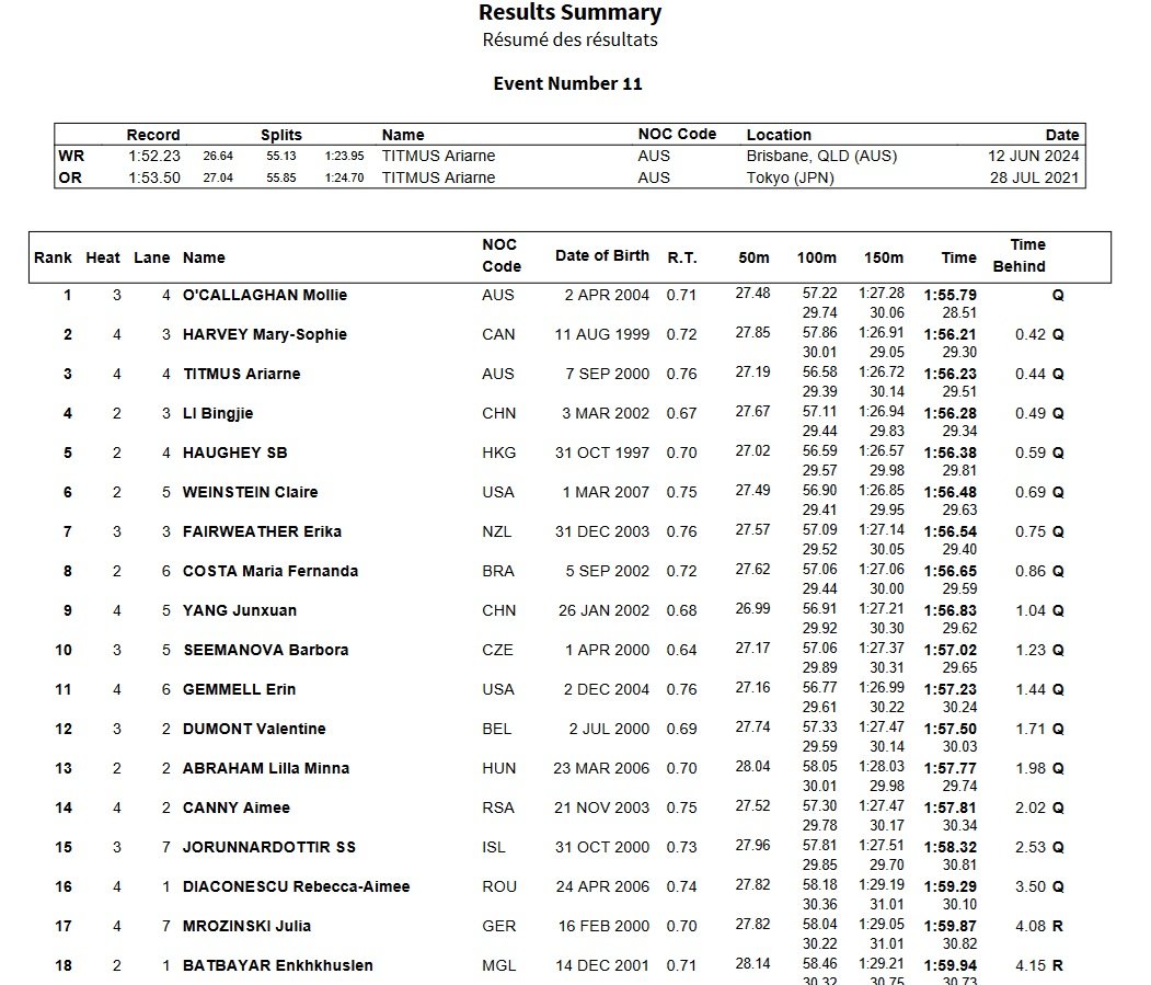 Titmus and O’Callaghan are the only swimmers in the field to have gone sub 1:54 this year (Summer McIntosh, who isn’t swimming it, also has). In a slow prelims – it took 1:58.33 to make semifinals in Tokyo, then 1:59.29 Sunday,