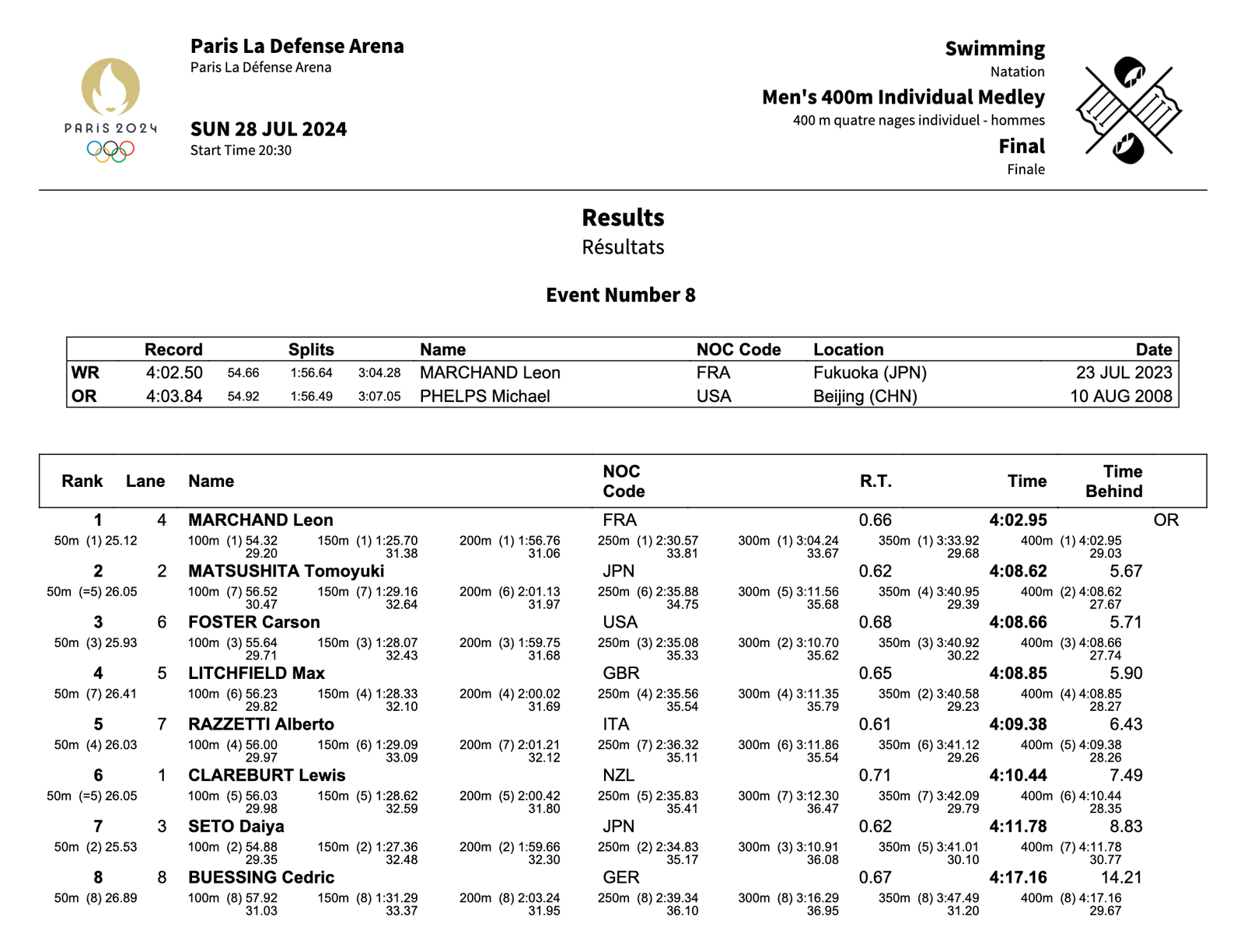 1. Leon Marchand (France) – 4:02.95 Olympic Record
