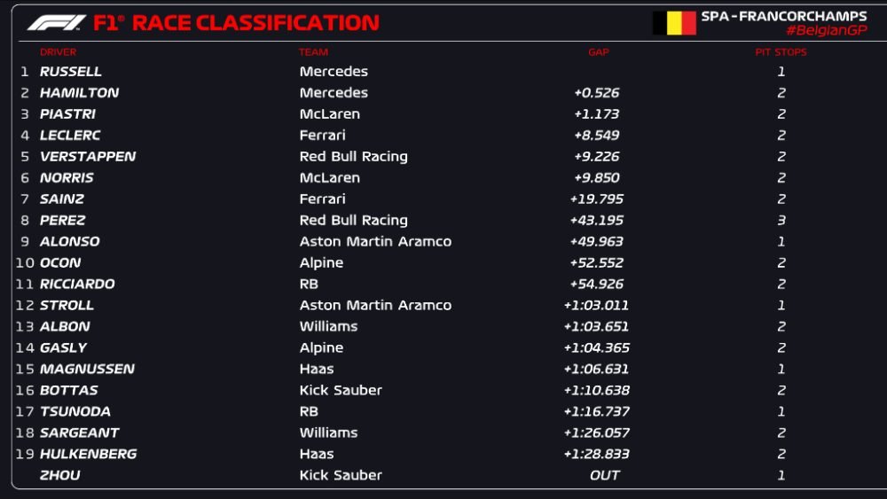 In the end, the lap count prevailed in favor of Mercedes and Russell. Fending off Hamilton’s DRS advances five times, he took the checkered flag by just 0.526s.