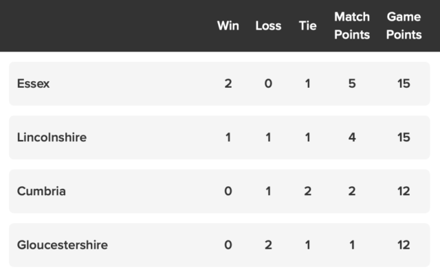 Lincolnshire went about their business with a fine 6-3 win over Cumbria, which saw four of the six games go to the wire, meaning all eyes were on Essex who needed to win 5-4 overall against Gloucestershire.