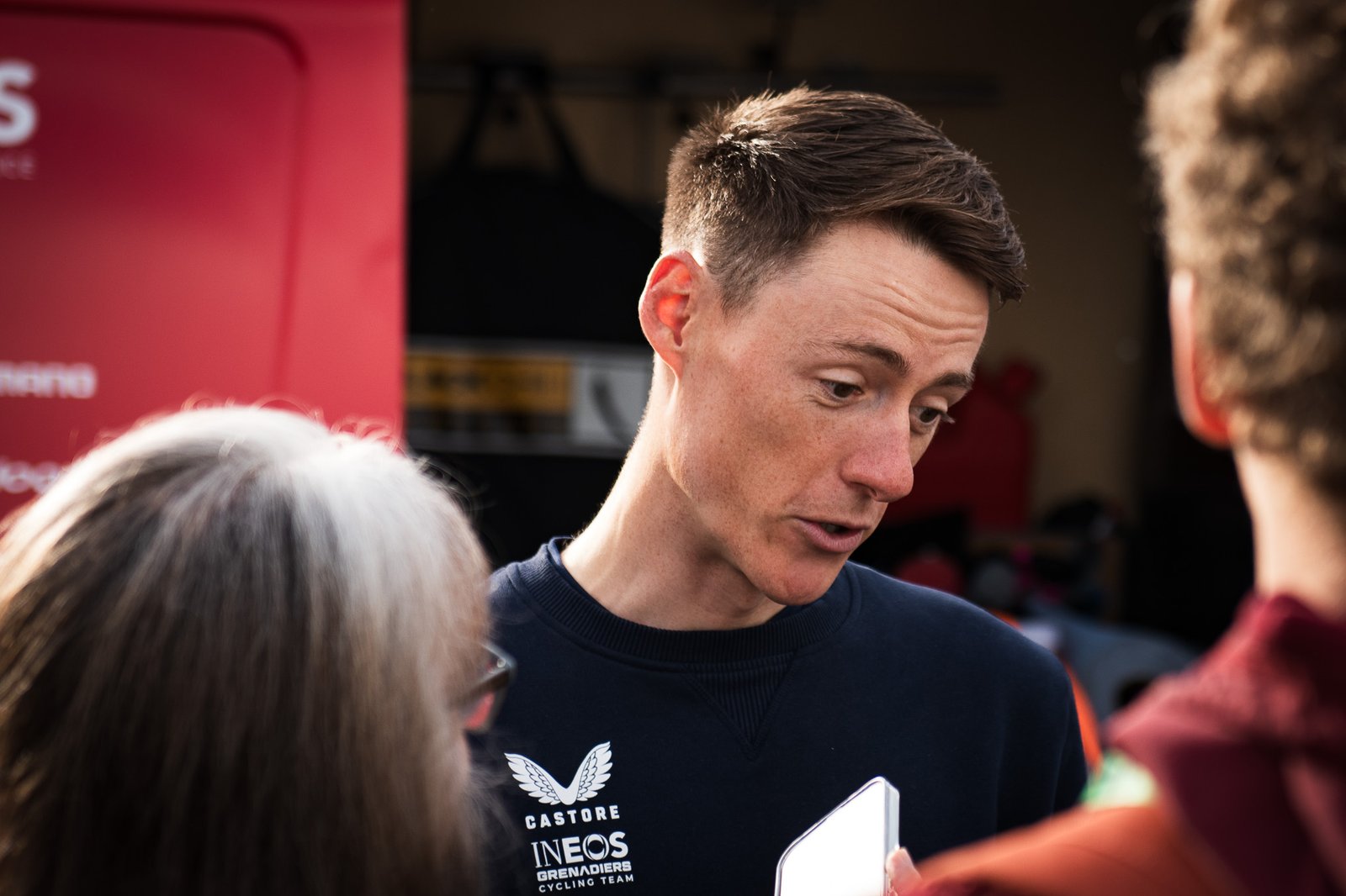 “I think it adds a little bit more pressure, because the other gravel races that I’ve done this year I’ve just been there by myself, with my wife, my son,” he said as he stood by the Ineos team vehicle at the start in Halle.