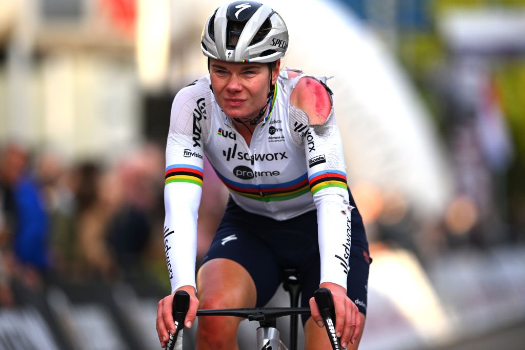 Anniina Ahtosalo (Uno-X Mobility) had her front wheel taken out by the Truyen’s rear wheel, making the Finnish champion go to the ground as well. Truyen’s teammate Julie De Wilde had to brake hard to avoid Kool’s flying bike, stayed upright, but then stepped off the bike to check on Truyen and collect herself.