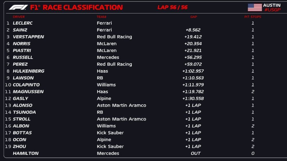 Fernando Alonso finished 13th ahead of the frustrated Yuki Tsunoda. Lance Stroll finished 15th ahead of Alex Albon, Valtteri Bottas, Esteban Ocon and Zhou Guanyu.