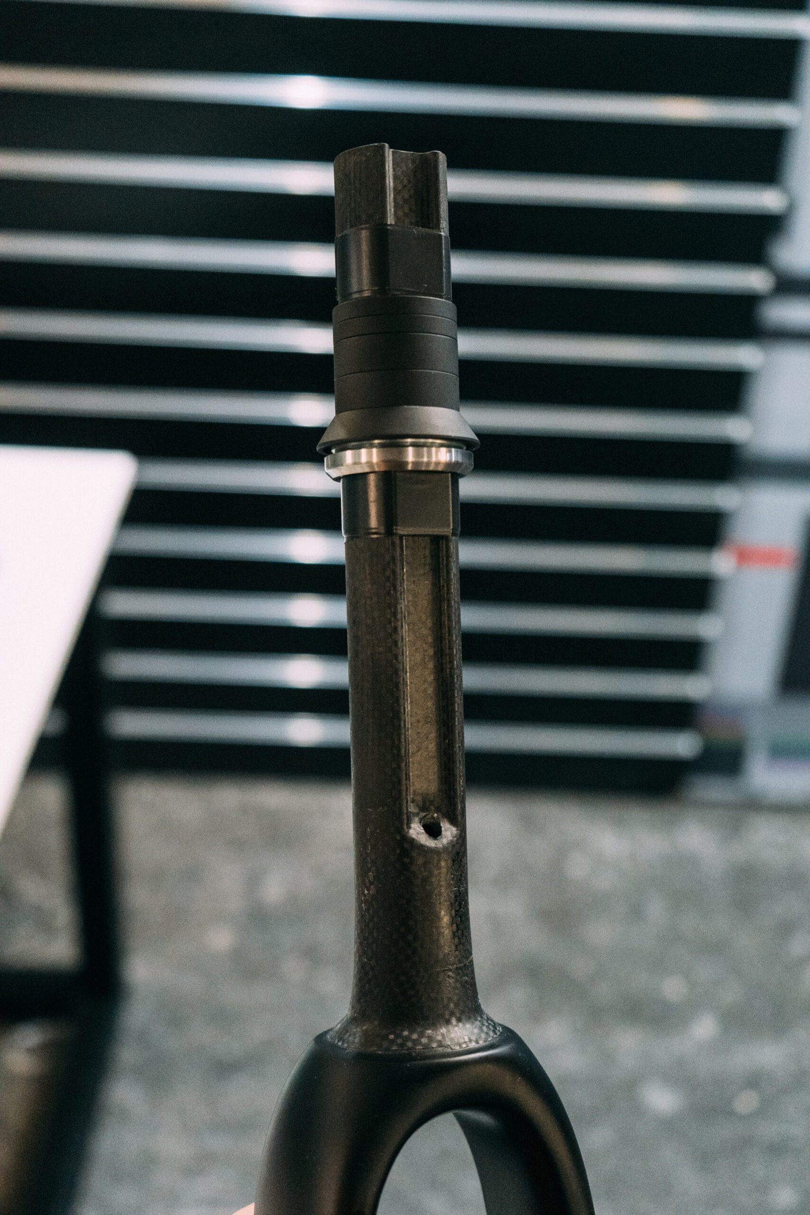 I didn’t get many shots, such was my whirlwind visit along with a slight language barrier, but from what I gathered the fork, in combination with a corresponding stem features a large channel down the front through which a front hydraulic brake hose can be fed.