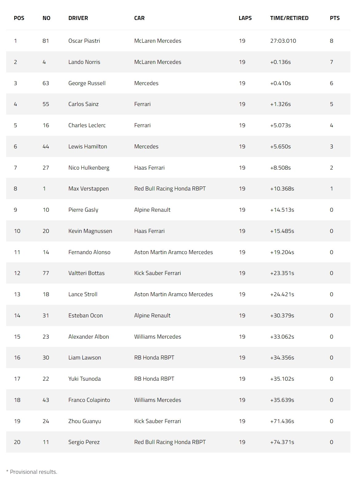 Franco Colapinto finished 18th after overtaking Sergio Perez at the pit lane exit, both having started off the grid following overnight set-up changes.