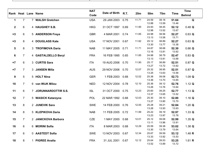 Siobhan Haughey, silver medallist at Melbourne 2022, was second through in 52.12 with Freya Anderson and Kate Douglass both clocking 52.27 into Wednesday evening’s semis.