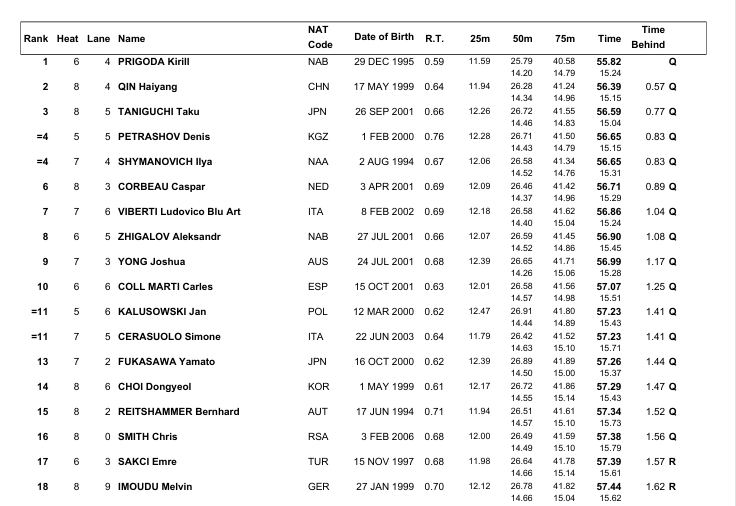 Qin Haiyang, fourth at Melbourne 2022, was next through into tonight’s semis in Budapest in 56.39 with Taku Taniguchi posting 56.59 and Shymanovich and Denis Petrashov both navigating safe passage in 56.65.