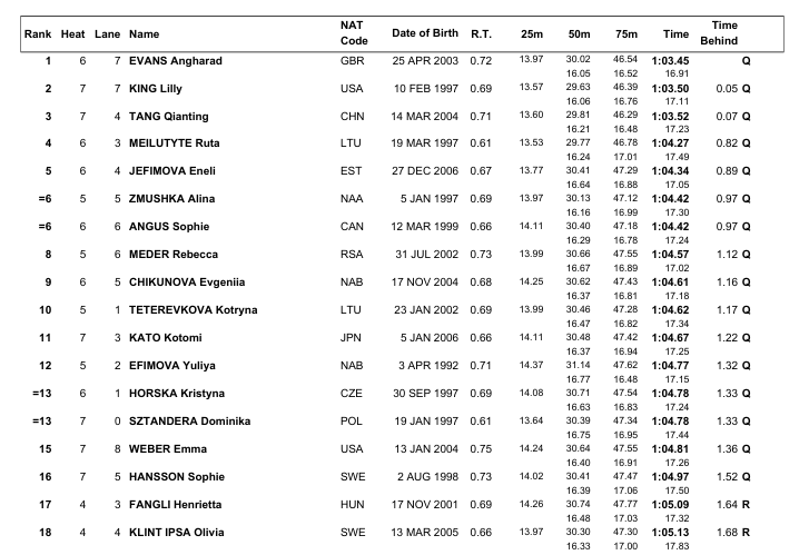 Angharad Evans who topped the prelims in a British record of 1:03.45 ahead of Lilly King (1:03.50), Tang Qianting (1:03.52), Meilutyte (1:04.27) and Eneli Jefimova (1:04.34).