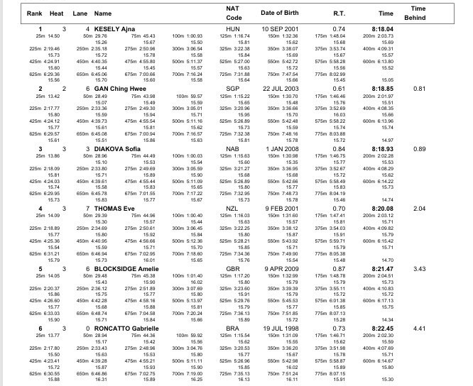 Kesely topped the field in 8:18.04 followed by Singapore’s Gan Ching Hwee (8:18.85) and neutral athlete Sofia Diakova (8:18.93).