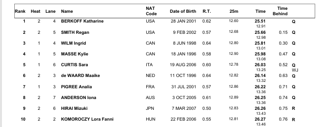 Iona Anderson of Australia booked the final place in 26.25, 0.01 ahead of Mizuki Hirai who clocked 26.26 as first reserve.