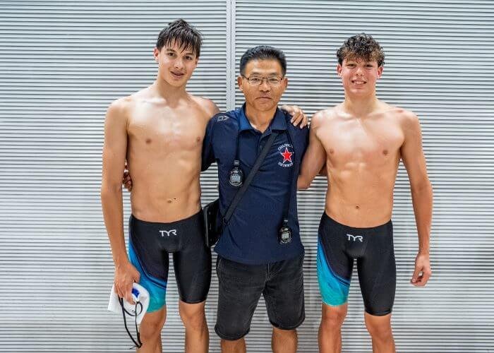 Lincoln Wearing (L) with twin brother Isaac Chandler Head Coach Tsuyoshi Kimura and Swimming QLD coach Brant Best 2024 QLD Champs. Photo Courtesy Wade Brennan