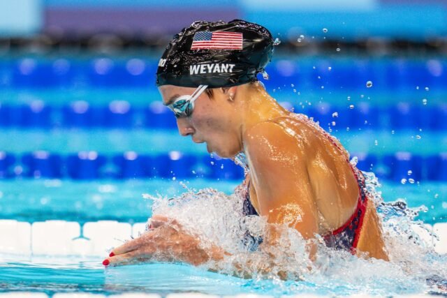#51: Emma Weyant, USA (2024 Rank: NR) — Emma Weyant is a staple in the 400 IM World Rankings. Weyant chooses to spend most of the year competing in the NCAA for the University of Florida, and she only swam at one of the three major international meets last year, the Olympic Games. At the U.S. Olympic Trials, she finished 5th in the 200 breast and 2nd in the 400 IM. She went on to win the bronze medal in the event at the games, swimming 4:34.94. Her time ranked her 6th in the world in 2024. She also sat in 46th in the 400 freestyle, showcasing that her freestyle skill extends to long-course meters. Her consistency in the 400 IM is what earned her the top spot in this half of the list. When she gets on the blocks for the 400 IM, she is a serious medal contender, no matter who else is there with her.