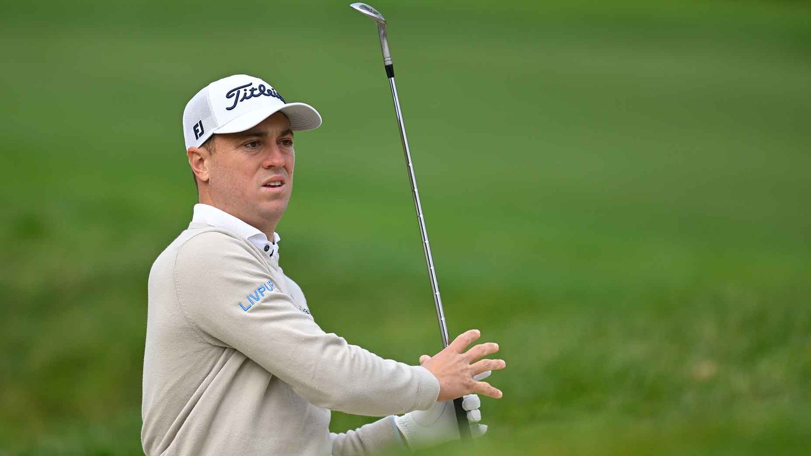 justin thomas swings wedge in cream sweater at the AT&T Pebble Beach Pro-Am.