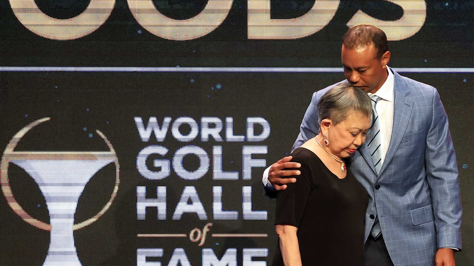 tiger woods embraces with mother tida woods in blue suit and black dress at hall of fame induction ceremony.