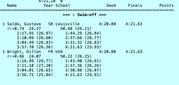 Wright then made a big move on the penultimate 50, splitting 25.84 to Saldo’s 26.38 to open up nearly a full second lead (0.98), but Saldo had saved up for the push for home. Saldo blasted his way to a closing split of 23.93, catching Wright on the last stroke as the two swimmers incredibly tied again, putting up matching times of 4:21.63.