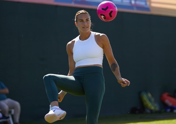 These days instead of smashing her racquets, Sabalenka has been getting her kicks playing soccer on the grassy field next to the practice courts in Tennis Paradise.