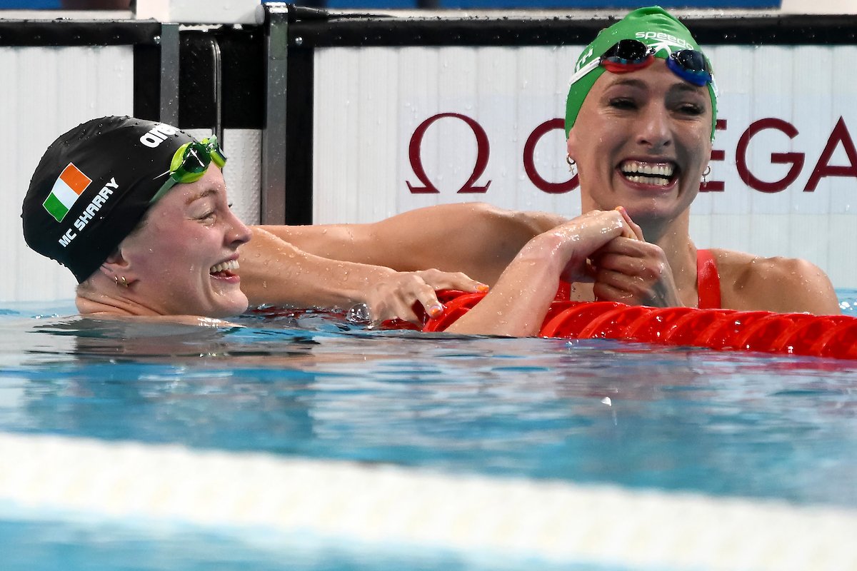 McSharry’s second Olympics exceeded all expectations. She was part of an all-time final in the women’s 100 breaststroke, touching third in 1:05.59, .01 ahead of Lilly King and Benedetta Pilato in a field where six tenths blanketed the top six finishers. The bronze made Olympic history for Ireland, whose only other swimming medals had come in 1996, belonging to Michelle Smith, later banned for anti-doping violations.